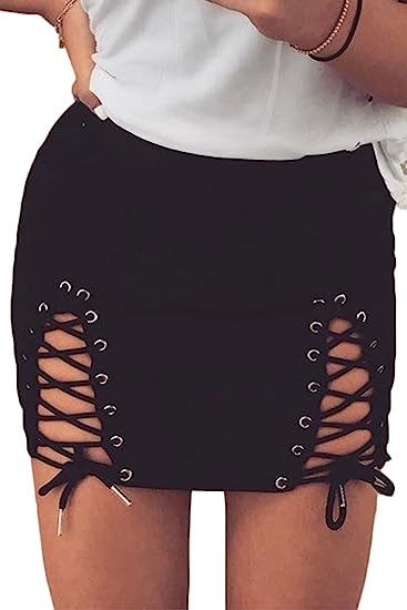 Double Criss-Cross Lacing Up Split Side,High Waist Bodycon Faux Suede Mini Pencil Skirt.